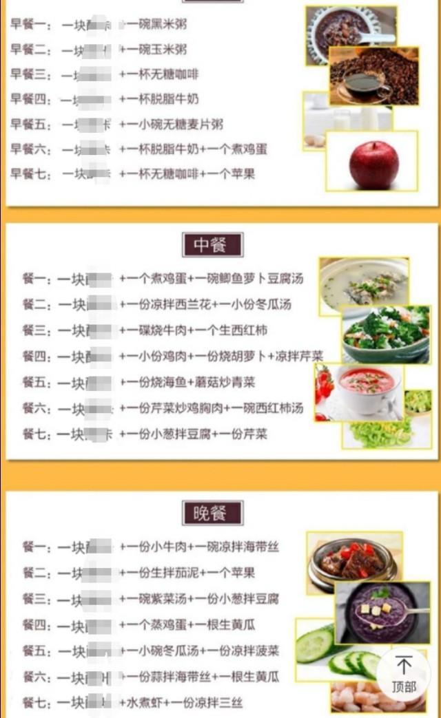 我看了这些玩意的成分要晕死。没有什么有价值的营养成分,以上图片这款减肥饼干,除了碳水化合物,居然还有两种最廉价的食物油:椰子油和棕榈油。基本没有什么有价值的成分,这些饼干是怎么达到减肥效果的呢?简直就是满满的套路。竟然给消费者制定了食谱,让消费者按食谱吃,然后配上饼干。下面是某减肥饼干给消费者制定的食谱。