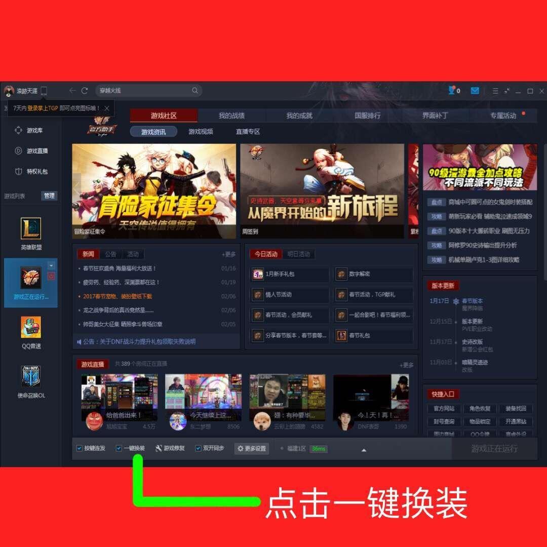 登入TGP,游戏运行开始后点击绿色划线这里一键换装