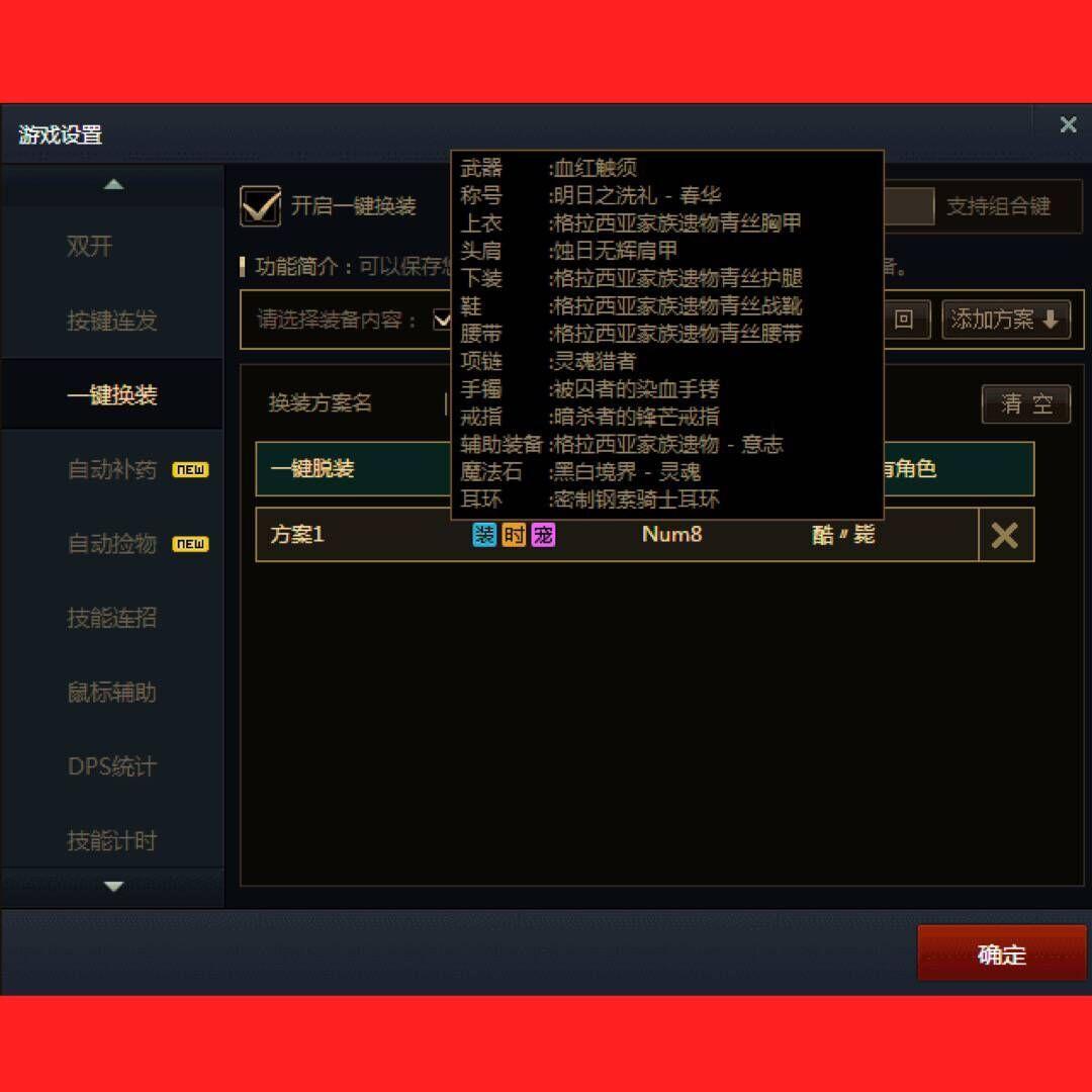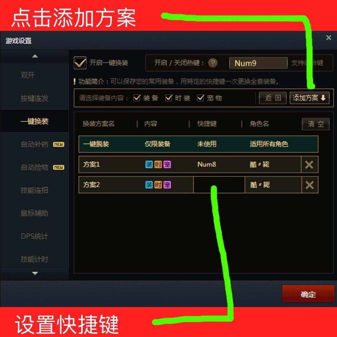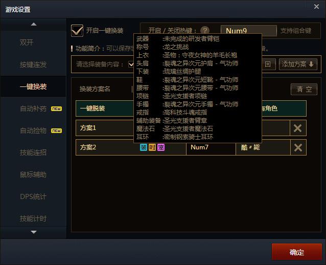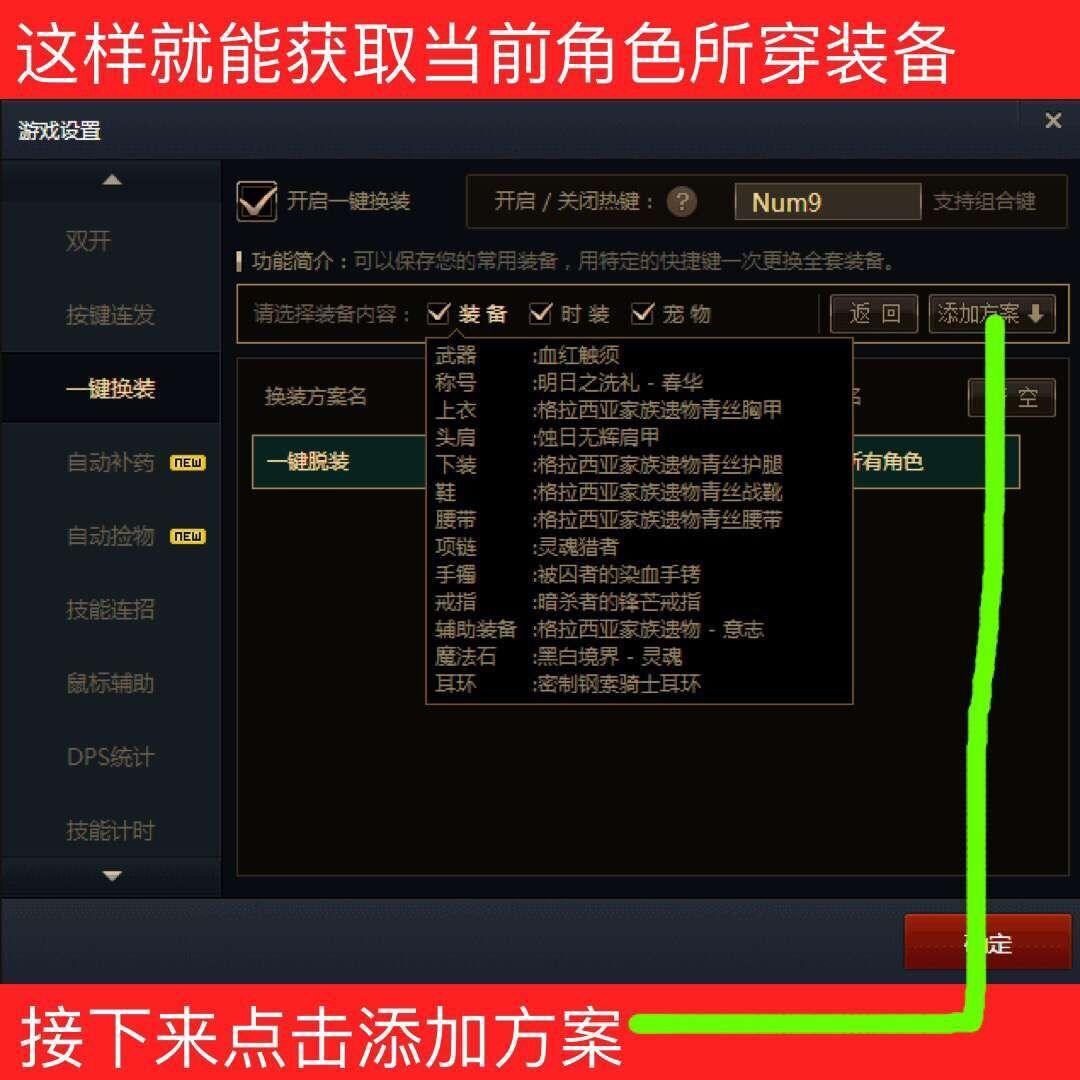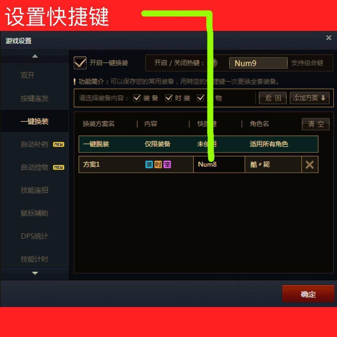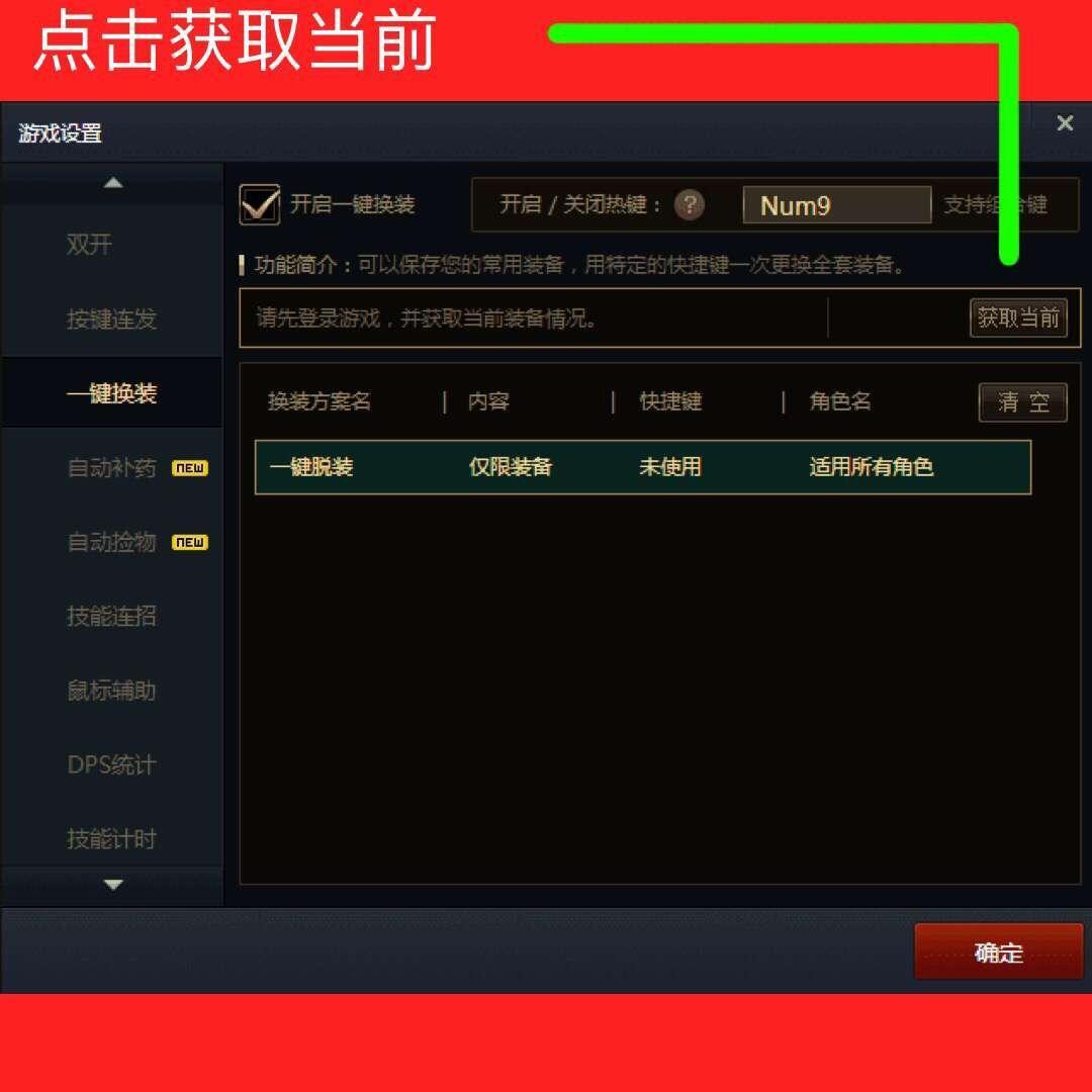 首先你要设置一个开启一键换装的功能键,数字键盘那里选一下比较方便。游戏登入后穿上你的第一套装备
