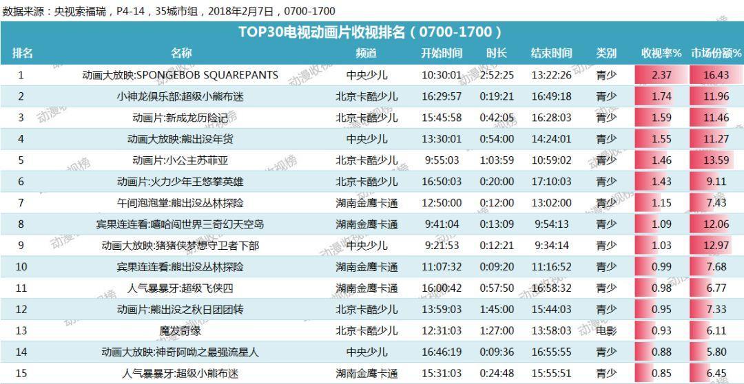 在 0700—1700 收视时段内,中央少儿 的 《 SPONGEBOB SQUAREPANTS 》 排名第一,收视率为 2.37%; 北京卡酷少儿 的 《超级小熊布迷 》和《新成龙历险记 》 位居二、三名。