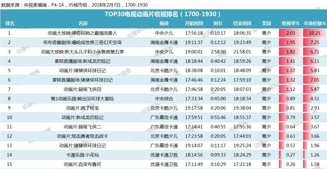 在 1700—1930 收视时段内,中央少儿 的 《神奇阿呦之最强流星人 》 排名第一,收视为 2.03%; 湖南金鹰卡通的《嘻哈闯世界三奇幻天空岛》和中央少儿的《新大头儿子和小头爸爸第四季》位居二、三名。