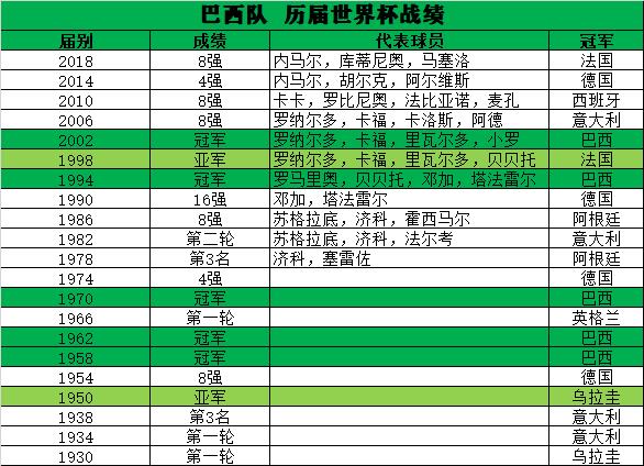 纵观巴西队参加历届世界杯的全部记录,巴西队历史上5次赢得世界杯冠军,另外有2次屈居亚军,分别是1998年不敌法国队,1950年不敌乌拉圭队。