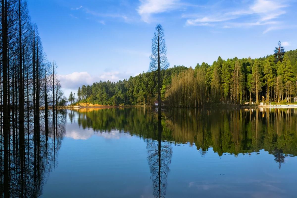 海拔1530米的月亮湖,似一弯明月悬挂在山顶,笔直的云杉矗立在湖水之中,美不胜收。