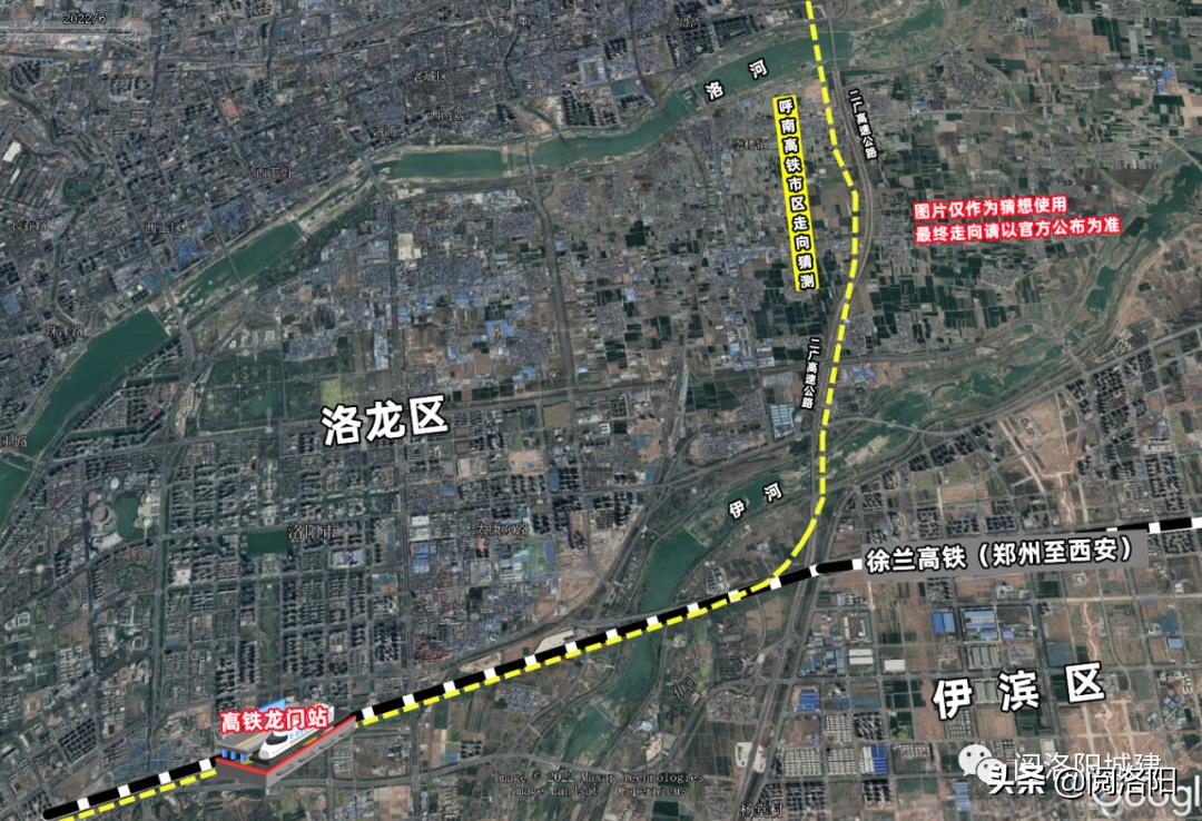根据小编猜想,呼南高铁市区段大概率是沿着二广高速公路敷设,在跨越伊河后向西转弯与徐兰高铁线路并排,而后进入洛阳龙门高铁站。
