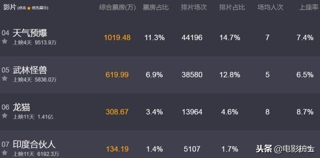 《武林怪兽》首周末3天仅收得5215万元,目前实时收619万(截止20点20),上映4天累计5836万,今天全天累计也就6000万出头。场次大缩水,上座率也垫底,口碑又扑街,以这样的票房走势要想破亿太难了,古天乐周冬雨尴尬了,一众巨星也没扛起票房。