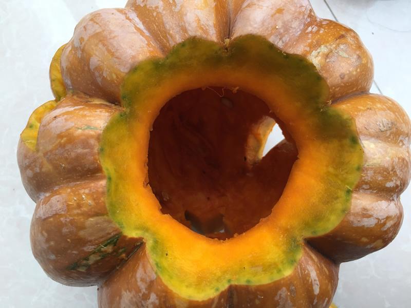 (4)清理南瓜的瓜瓤和瓜子,使用勺子或者手都可以,注意力度,瓜子留着别扔,晒干可以食用,当然保存起来做为种子,明年可以种出更多的南瓜也是一个不错的主意。