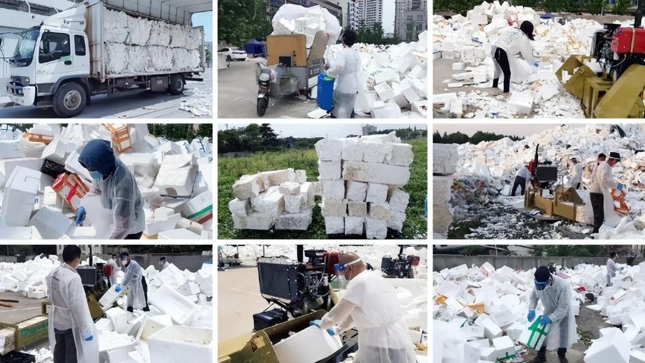 第一步:收集废旧泡沫。从物流集散基地、海鲜批发市场、生鲜及冻品厂家、电商基地、酒店超市等地方回收废旧泡沫塑料。