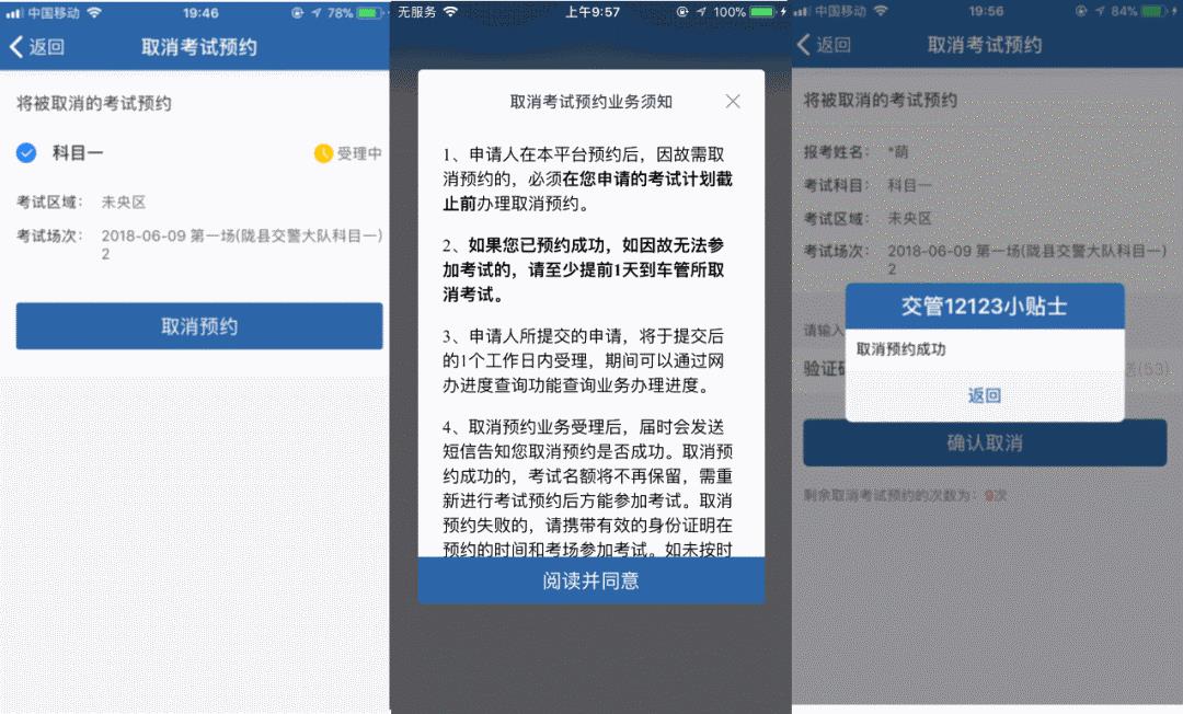 用户登录“交管12123”APP后,通过【业务中心】→【取消考试预约】,进入取消考试预约业务流程。