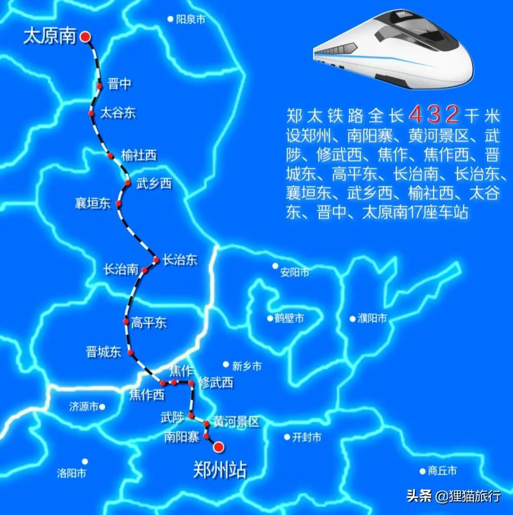 如今郑州市民可以坐着高铁去太原,一路上从郑州站走京广铁路往北到达南阳寨站,沿途一共经过17座车站,包括南阳寨站、黄河景区站、武陟站、修武西站、焦作站、焦作西站、晋城东站、高平东站、长治南站、长治东站、襄垣东站、武乡站、榆社西站、太谷东站、晋中站、鸣李站(不办理客运)、太原南站。
