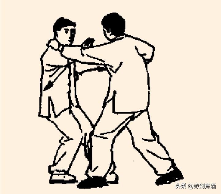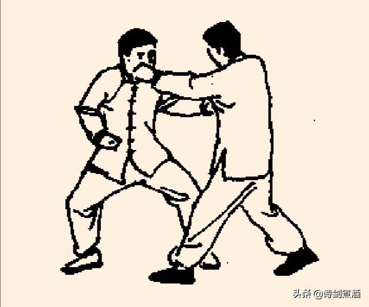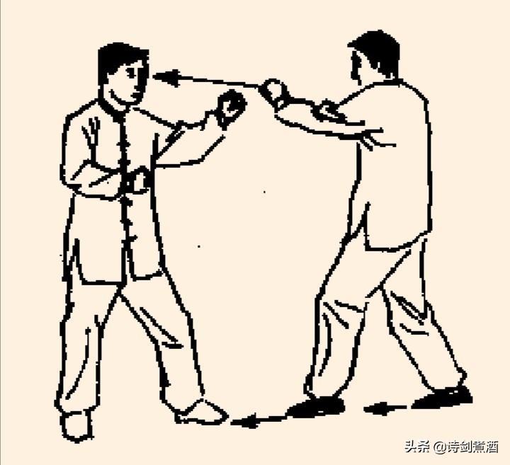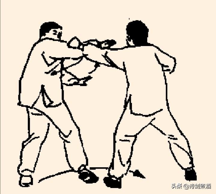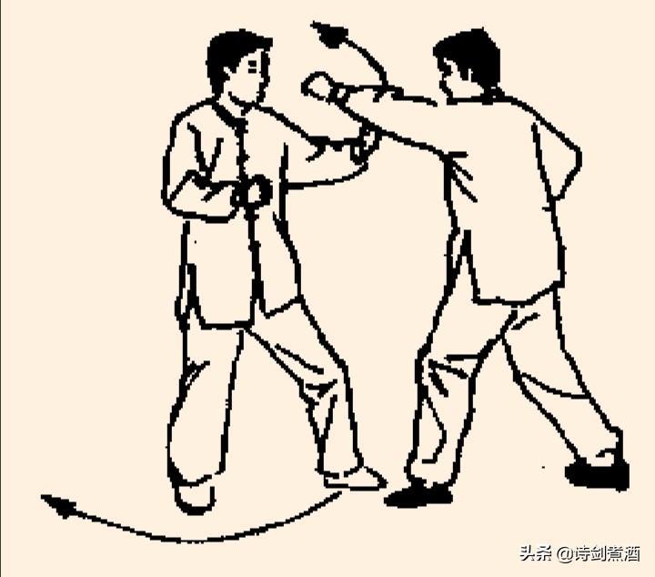 上动不停,甲左脚向左弧形步落于乙体右前,同时左手继续向右拨划,右掌划落于左腋下