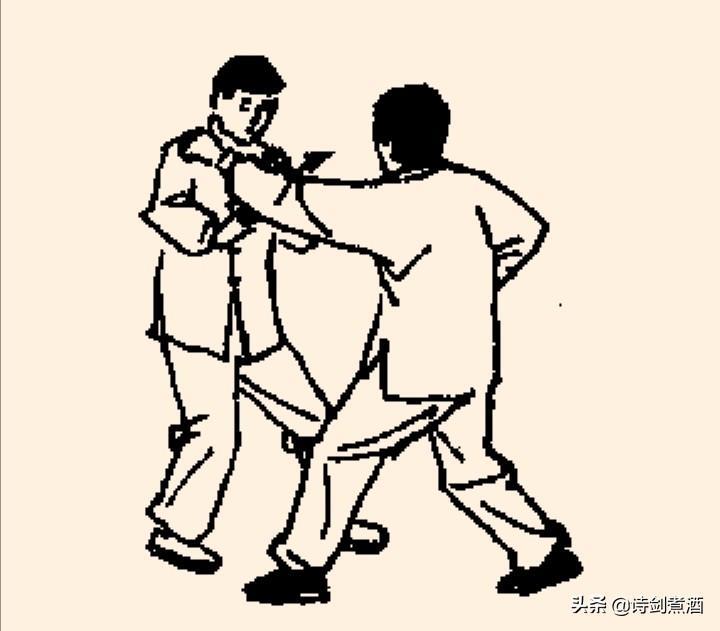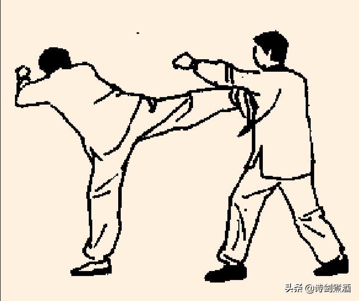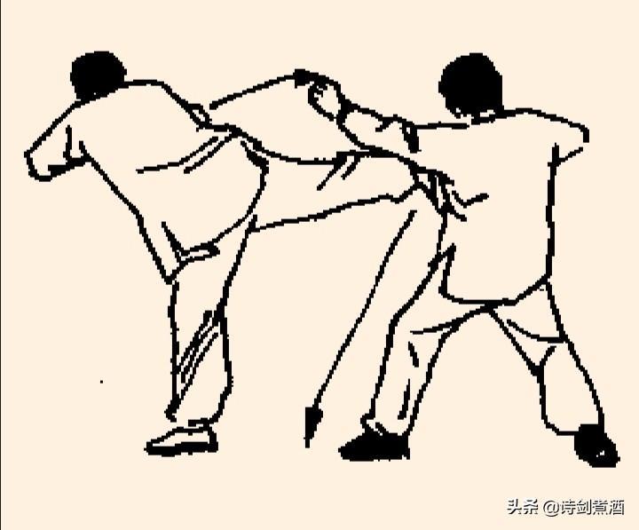上动不停,甲身体倒成水平。猛然伸腰展胯向后蹬腿,以脚跟猛蹬乙胸部。