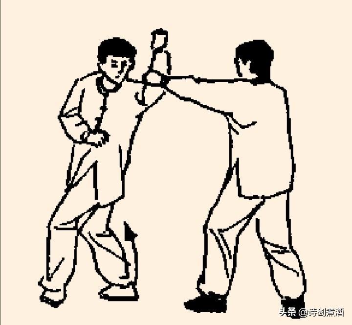 注析:此招拳谱中所言“紫燕斜飞轻又速,翻云展翅暗藏刀”,“紫燕斜飞”喻掩肘蹬腿,“暗藏刀”是指马步顶捶。翻身落步后加顶捶,且是弧形绕步后击出,隐蔽效果好,极易得手。