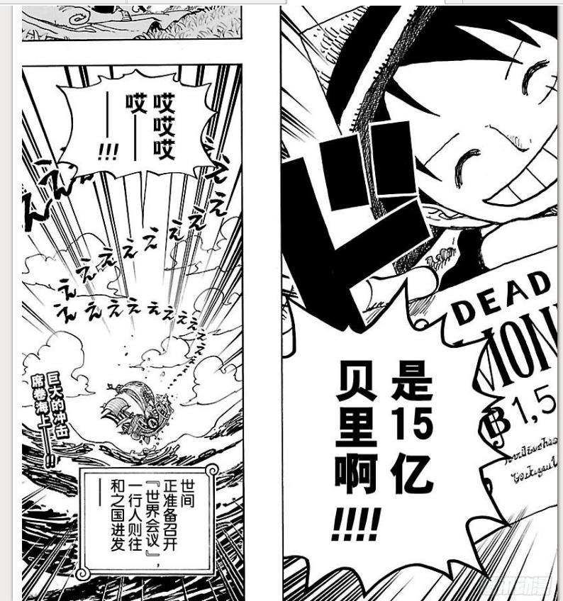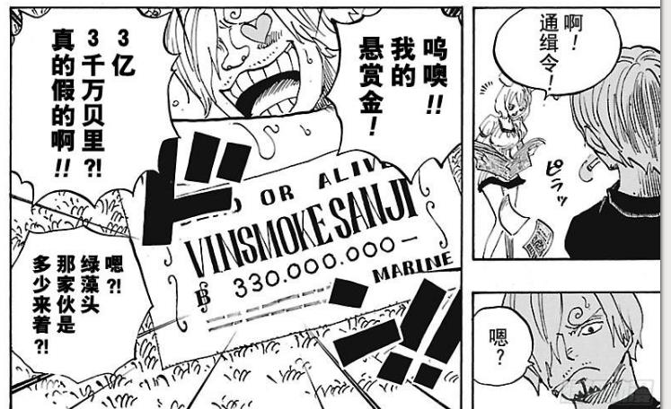 路飞的事情震撼了新世界的四皇,同时也震撼了世界各国的人,路飞刚拿到自己悬赏金纸张的时候,以为自己的悬赏金掉了,是1亿五千万,后来布鲁克认真的看了看,发现路飞好像看少了一个零,一个一个算过去的时候,整个草帽海贼船上的人都惊讶了,而另一边的山治此时还为自己的悬赏金高兴,毕竟是3亿3千万嘛,已经超过了索隆的悬赏金,不过他是靠文斯莫克恶名才升上来的,不得不说很悲剧。