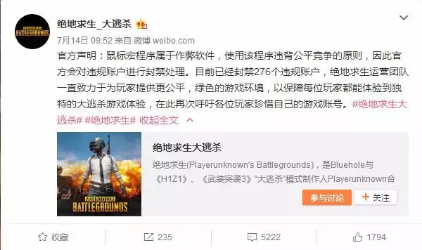 17年7月14日,《绝地求生》官方在微博平台发布声明:鼠标宏程序属于作弊软件,使用该程序违背公平竞争的原则,因此官方会对违规账户进行封禁处理。这一声明的发布,让不少痛恨鼠标宏的玩家再一次坚信,鼠标宏就是外挂。