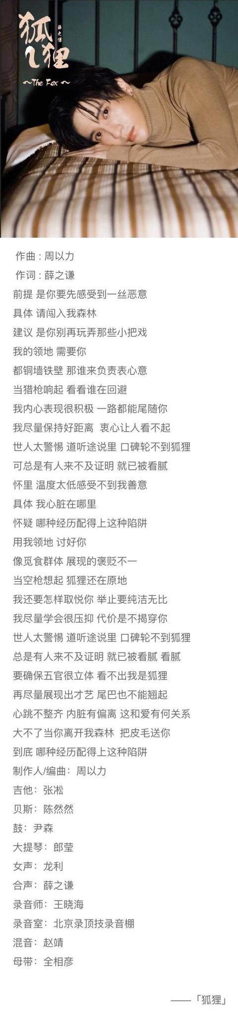 近日,薛之谦在微博毫无征兆的发布新歌,没有任何宣传,让粉丝们都措手不及,新歌名字《狐狸》,然而歌词却值得让人深究。
