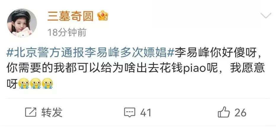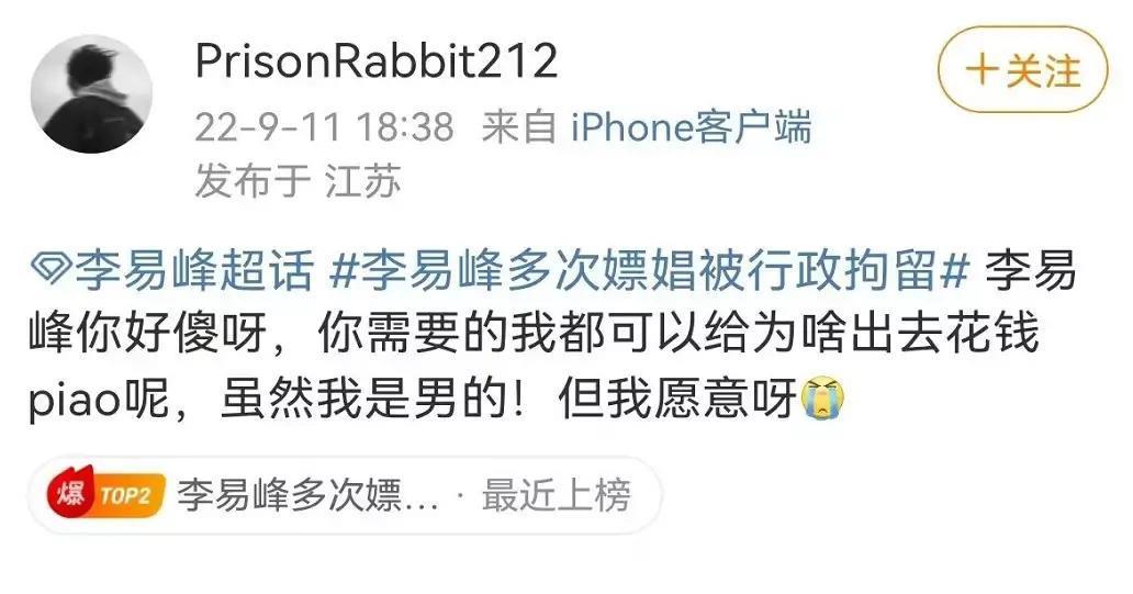 近日 ,北京警方抓获一位多次嫖娼的男性明星,随后便被爆料出正主是李易峰。