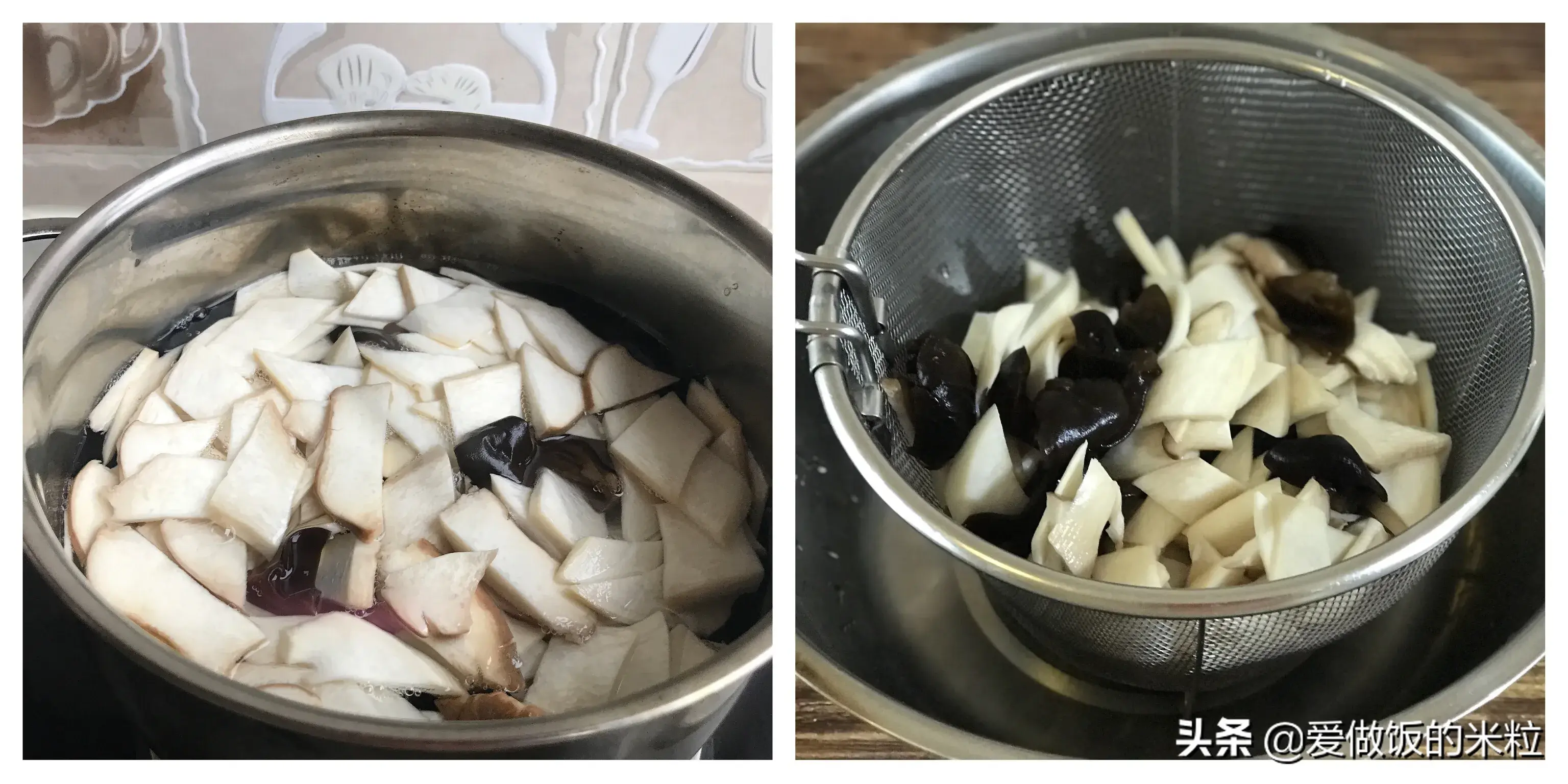⑦、起锅烧水,水开以后,下入杏鲍菇和木耳,焯水一分钟。然后捞出来,过凉水冲洗一遍。再沥干水分备用。(烹饪菌类最好都焯一下水。)
