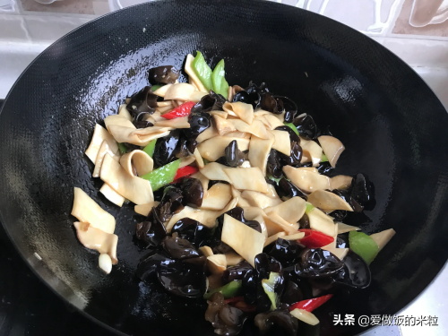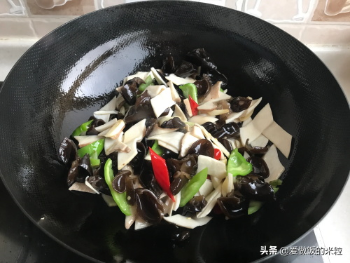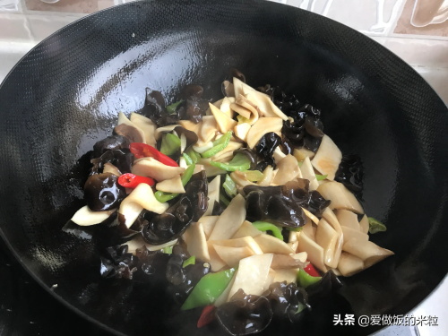 ⑨、下入杏鲍菇和木耳,翻炒均匀,炒20秒,先把水分炒出去一些。