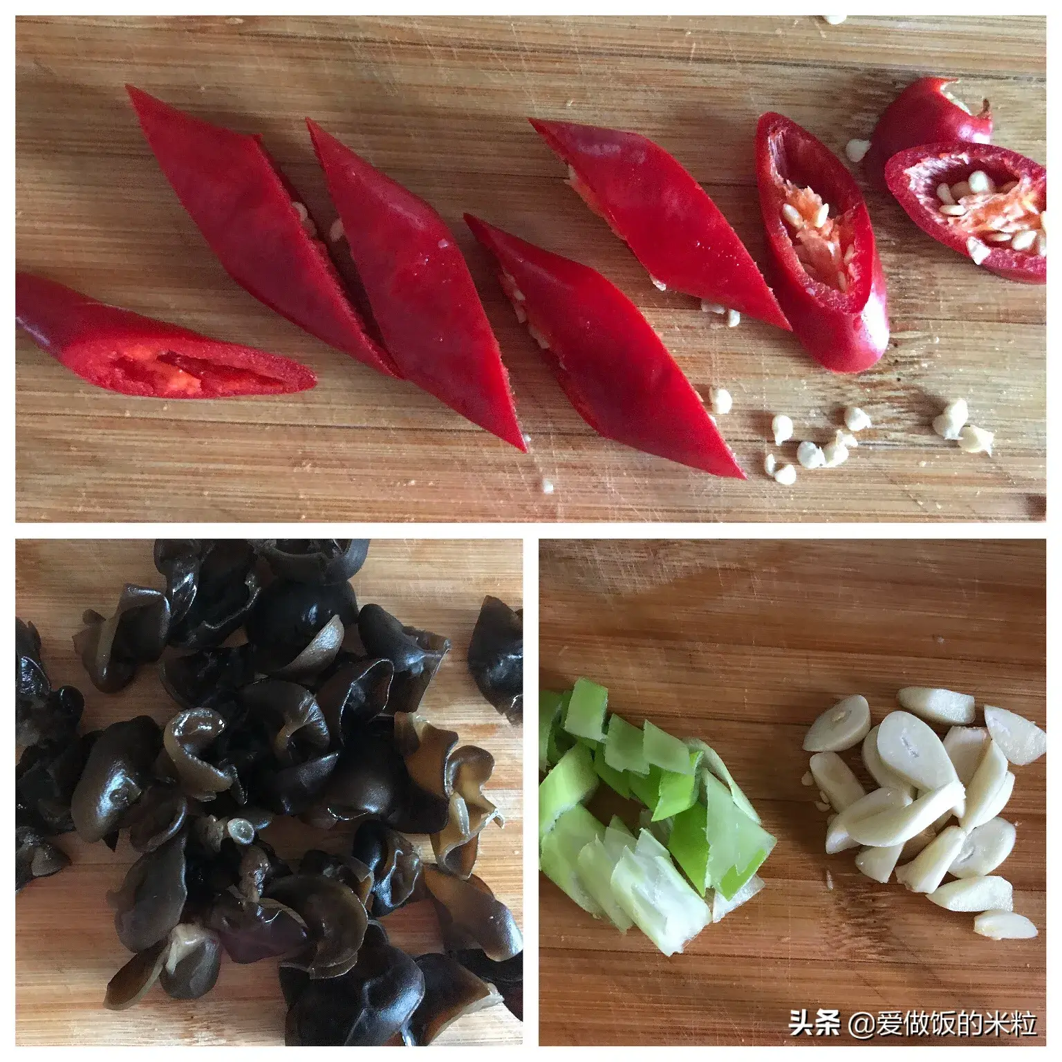 ⑤、把红尖椒斜刀切成段。把木耳也用手撕一撕,撕成小朵。把葱切成葱花,蒜切成片。