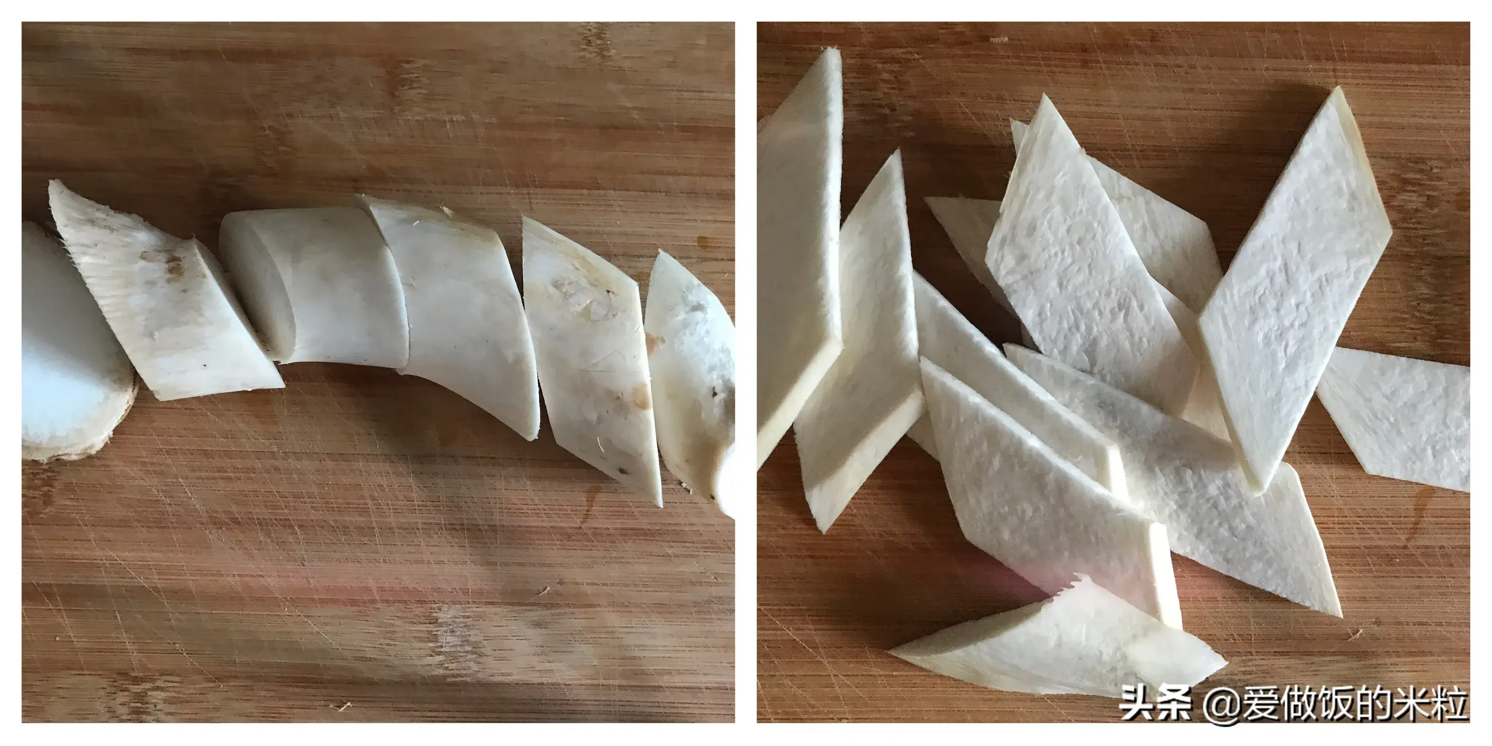 ③、把杏鲍菇先斜刀切成段,再切成菱形片。(从侧面切就是菱形片。)