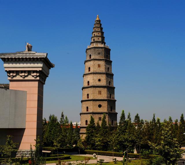佛塔是供奉佛祖舍利的建筑,是佛教的惯例。佛塔多为十三层是有一定寓意的,下七层寓“七级浮屠”,上六层寓“六道轮回”。佛祖生于二千五百年前的北印度迦比罗卫国(今尼泊尔南部),位于中国的西南部,所以各地佛塔也都建在所在寺院的西南角,朝向佛祖的诞生地,以示对佛祖圣地的向往与怀念。