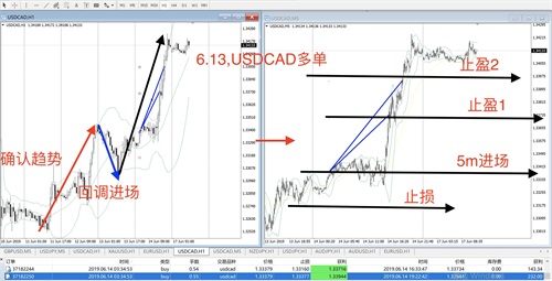 下图中USDCAD多单交易截图。下图左侧第一笔向上的箭头确认趋势;蓝色箭头回踩确认之后,图中右侧5m破位进场,止损在形态的低点,分别设置两个出场的点位。