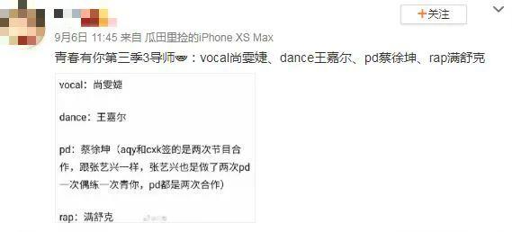 声乐尚雯婕、舞蹈王嘉尔、PD蔡徐坤、rap满舒克,都是专业且经验丰富的导师,如果名单属实,那真的可以期待一下。