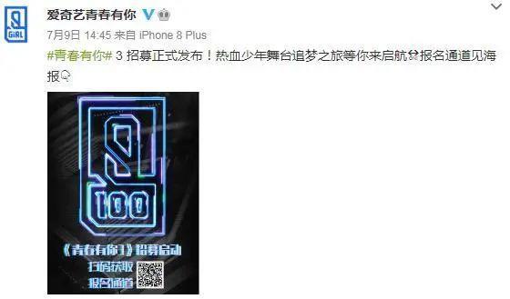 爱奇艺的《青春有你3》发布了招募海报,这次是选男团,18周岁以上的男性均可报名。