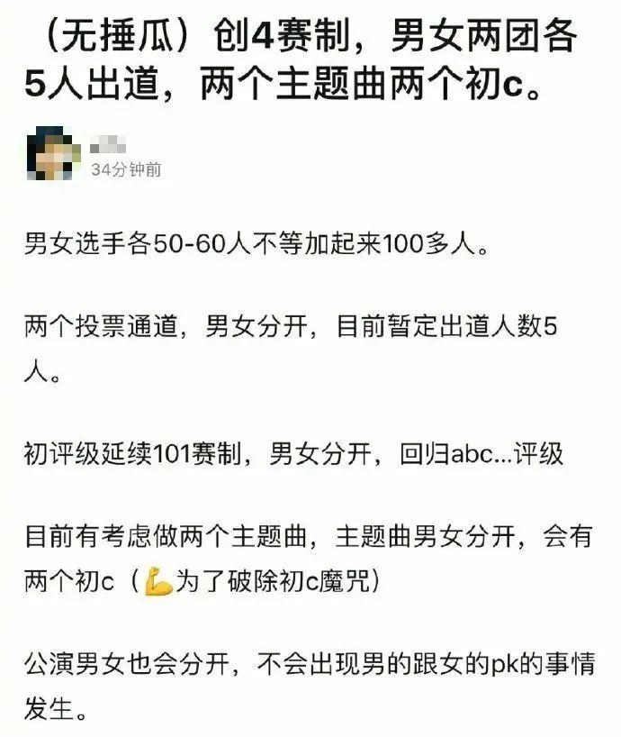有网友透露这次是男女选手各50-60人,加起来100多人,总决赛将开通两个投票通道,选出一个男团,一个女团,各五人。