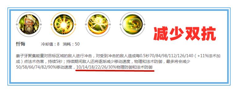 鬼谷子:一技能减少穿过目标25%的双抗妲己:被动最高减少216点法抗姜子牙:一技能减少目标30%双抗