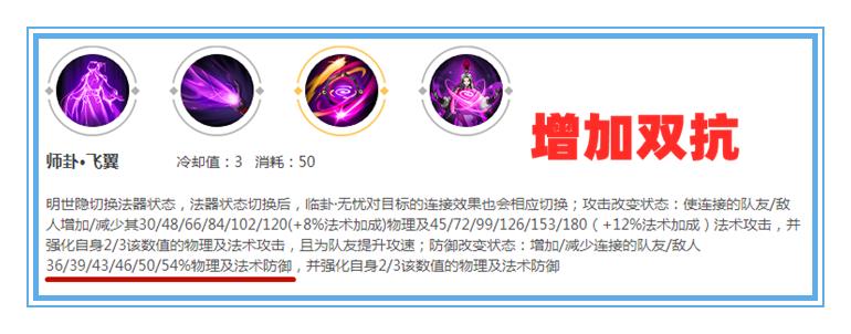 明世隐:黄链子最高增加54%双抗。蔡文姬:大招450+25%ap加成的双抗。牛魔:被动+200双抗刘邦:大招落地后+150双抗
