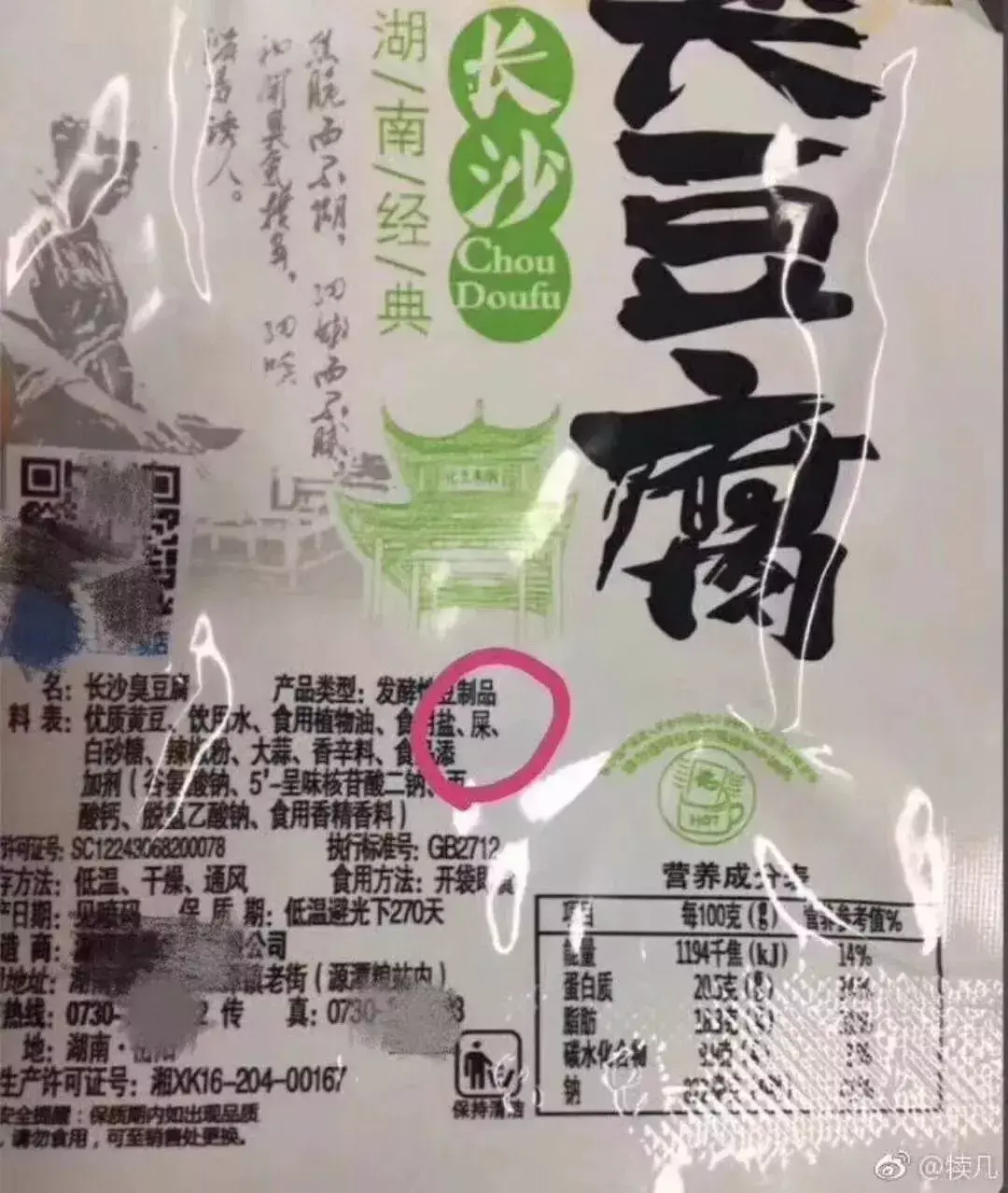 在臭豆腐的配料栏里,赫然写着“屎”这个配料。
