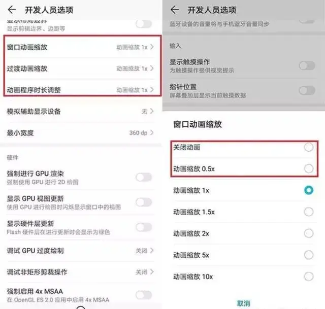 操作方法:在手机设置里找到【开发人员选项】,在里面找到三项动画调整:窗口动画缩放、过渡动画缩放、动画程序时长调整,将手机默认倍数调低或者直接关闭,手机各项动画操作运行都会提升很多。
