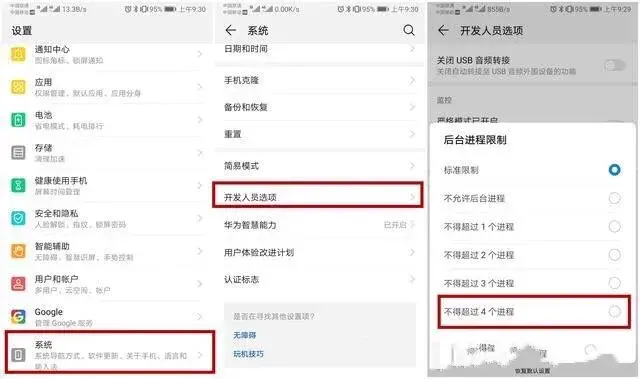 操作方法:在手机里找到【设置】→【系统】→【开发人员选项】→【不得超过2个进程】(具体限制几个根据自身情况而定,个人建议3个以内)