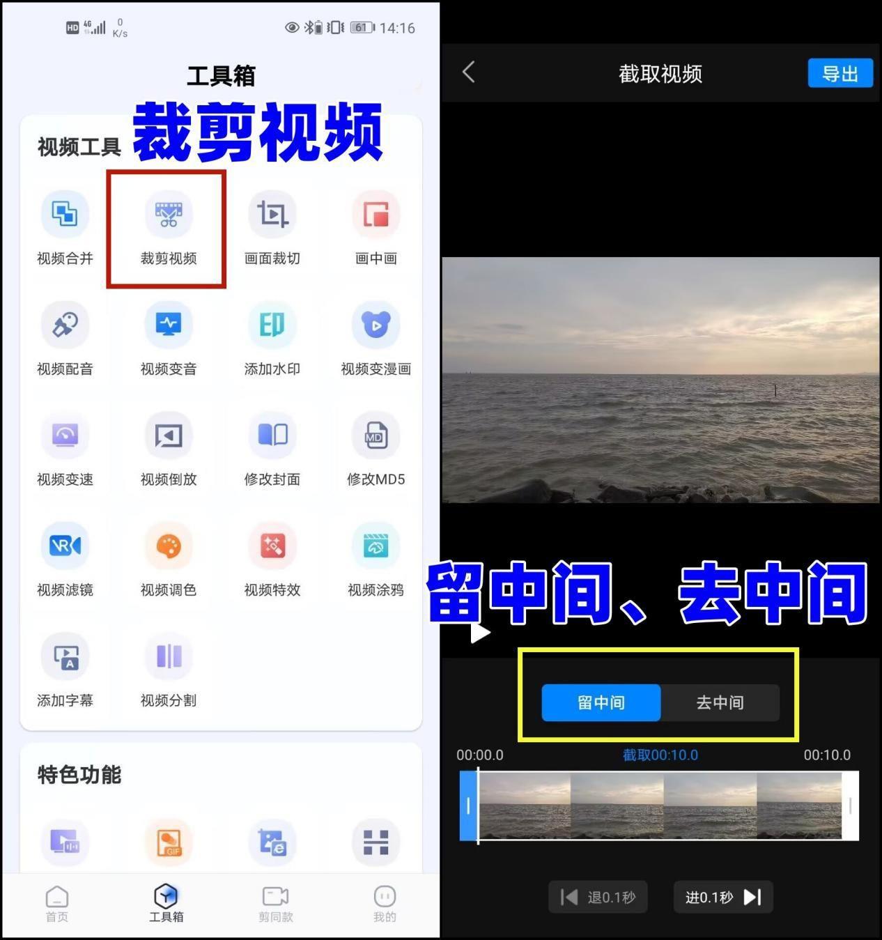 这是一个专业的视频剪辑软件,可以对视频进行各项专业剪辑任务,并且它还支持在手机和电脑上操作,方便我们使用不同的工具来进行操作。如果我们在手机上截取视频片段的话,只要将其打开,在页面上点击“裁剪视频”,将视频添加进来,我们可以选择去中间还是留中间,可精确到0.1秒,最后将视频导出就可以啦。