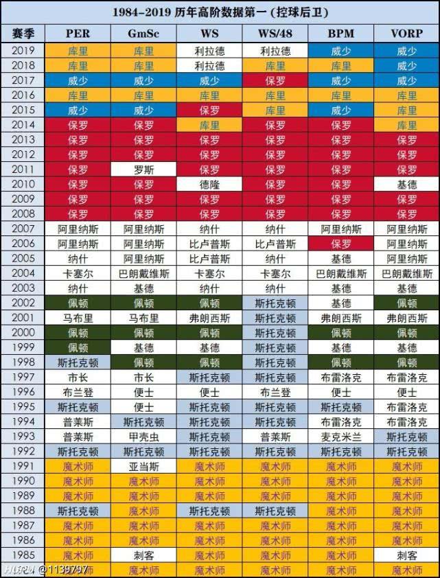 他们二者是两个不同时代的联盟第一控卫,怎么评价联盟第一控卫呢,全明星首发控卫与最佳第一阵容的控卫的位置可以说明一部分问题,从2009年到2014年(2010年除外),保罗一直是西部首发的控卫,在2008与2011-14年,保罗也是最佳第一阵容控卫的位置。而库里更不用说了,自2015年后全明星一直都是西部首发的位置,第一阵容也进了三次。高阶数据往往更能客观地反应事实,下面这张图很好地诠释了两个控卫在两个不同时代的统治力。因此我们可以得出结论:保罗在2015年前是联盟第一控卫,2015年至今这个位置是库里的。