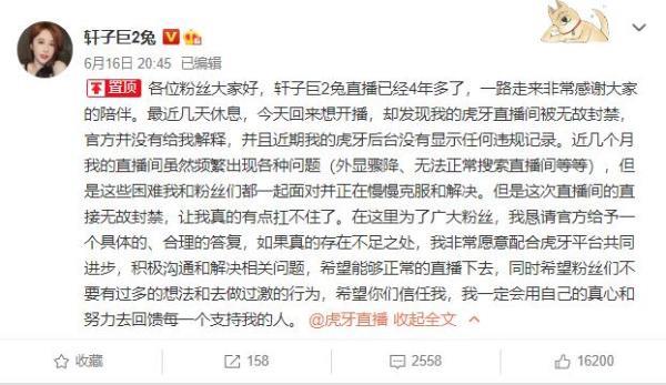 事件的起因源于该主播6月16日的微博,因为发现自己的直播间无故被封,在没有得到官方的解释下,她公开@虎牙,并且对粉丝们进行诉苦。而对于这样一件事,虎牙并未作出回应,虽然许多粉丝关心事件的进展,但最后轩子也只能无奈地表示:已委托律师在处理,同时法律程序也正在进行中。