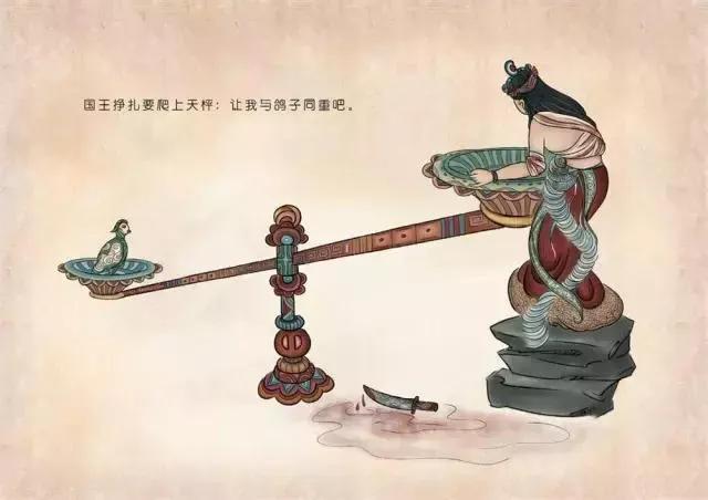 他把鸽子放在天平的一端,便命人用刀在自己大腿腿骨处,割下了一块他认为一定大于鸽子重量的肉,放在天平的另一端,可是奇怪的是,天平纹丝不动,尸毗王不解,便又拿起刀在自己身上割下了,第二块、第三块、第四块……直到他的身上已经没有多余的肉可割了,天平还是纹丝不动,这时在一旁的老鹰又冷笑着说:“一定要等重啊,不等重,不公平。”这时,尸毗王才懂得,想要救下这只鸽子,必须以性命交换性命,于是举身入进称盘。