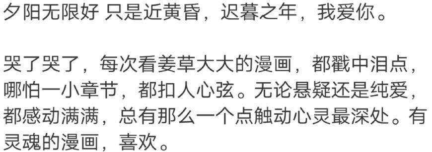 这只是一个很平凡很平凡的老人们的故事,并不像其他恋爱漫画那样轰轰烈烈,在这个年纪的他们可能就是等待着死亡来临的那一刻。也许他们遭遇了太多的不幸,也许他们在年轻的时候做了很多后悔的事情。但是在这个年纪,他们能相遇,遇到彼此。也许就是上帝的另外一扇窗。也许前半生开的玩笑,就是为了现在能够遇到真正的那个人。非常质朴的话语,没有过多的修饰,但是真实的情节却让人忍不住流泪。谁说我这个年纪的人就不能拥有爱情,只是他们没有遇到自己真正愿意托付终生的人罢了。这样的漫画并不多,可以说是我在这里看到的第一部这样的漫画。他们在不完美的时间遇见了不完美的彼此,但是这样的不完美撞在了一起,却又显得那样的完美。