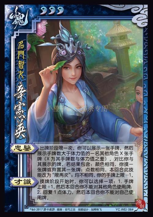 三国杀太能杀了玩三国杀这款游戏的时候,随着时间的推移,现在越来越多的武将都已经是历史中一些不引人注意的角色了,比如辛宪英,这是一个非常强势得武将,这个武将作为一个辅助定位的武将,她的英雄强度还是非常不错的。