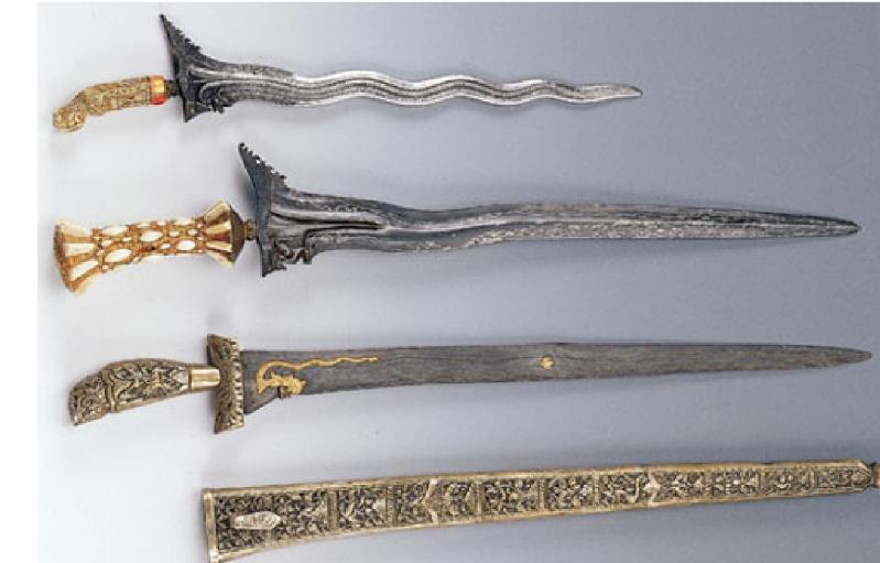 马来剑是一款南亚一带马来民族古代所用的剑,是古代马来武士随身携带的武器,长度类似短剑或者匕首,剑身弯曲锋利,类似波浪蛇形,剑刃处是波状渐尖造型,弯曲的剑柄,外加开口膨大的剑鞘,在剑刃尾处没有护手的刀锷,看起来极为不匀称,与中国传统剑的造型相差甚远,然而就是这样的造型设计却可以在有效范围内对敌人造成较大的创伤,它不是以防御为主,而重在进攻,马来剑的长度也不是固定不变的,根据需要在打造时会进行调整。有人称其为南亚冷兵器之王。