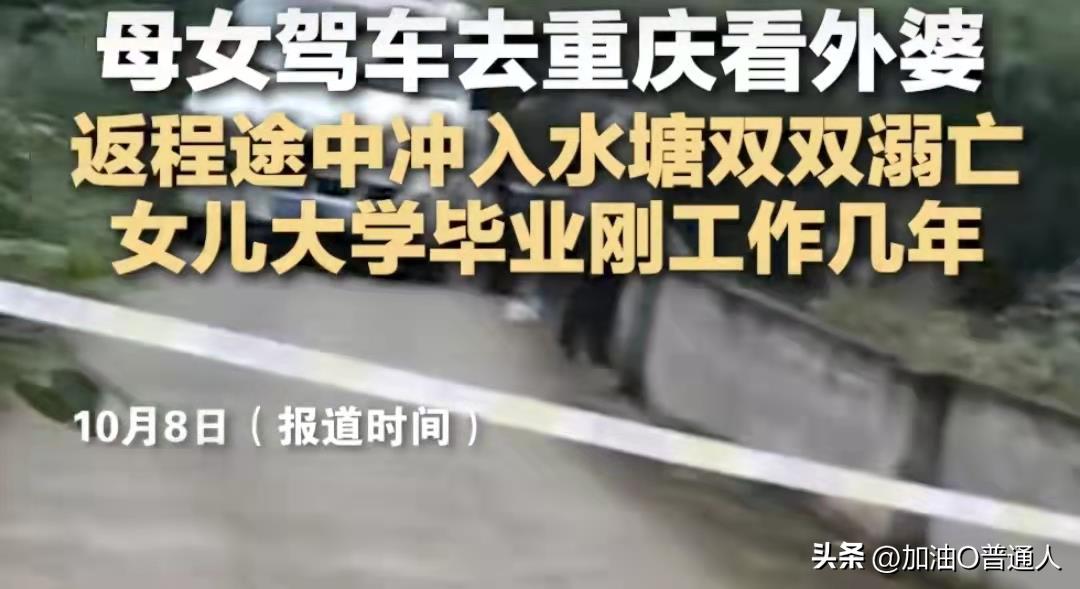 10月4号,在重庆市永川区境内的一个乡村道路上发生一起令人心痛的车祸。一对母女驾车去重庆看望女儿的外婆,返程途中冲入水潭双双溺亡。