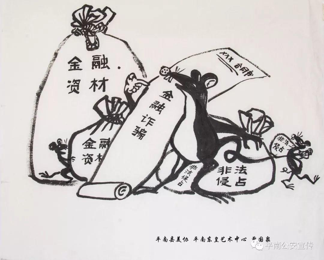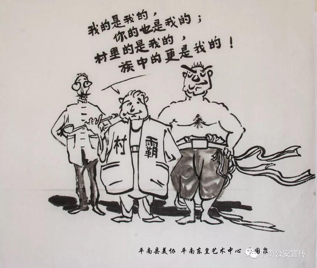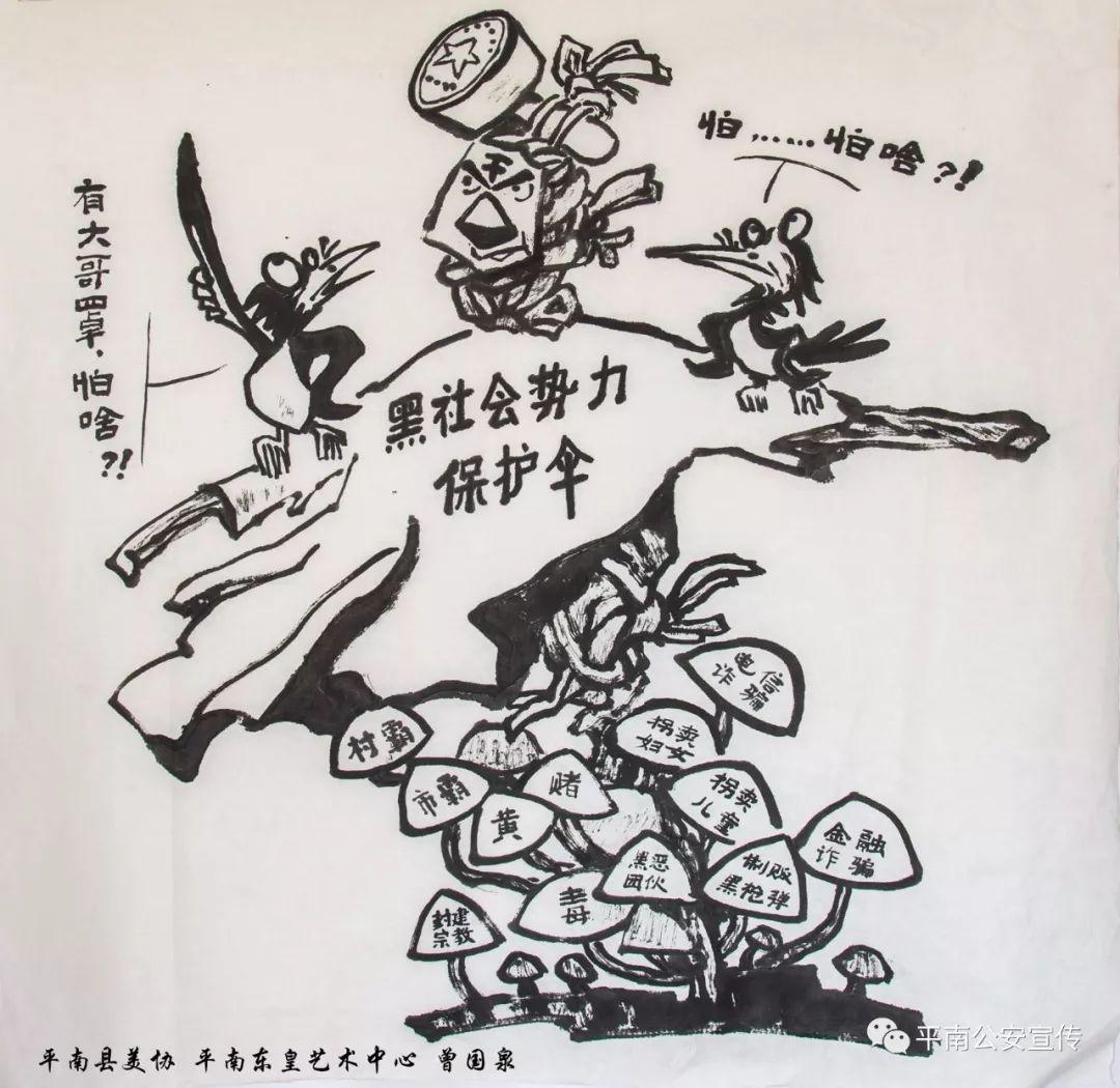 黑恶势力是经济社会健康发展的毒瘤,是人民群众深恶痛绝的顽疾,必须坚决依法予以打击。为了让更多的市民朋友能更加深入细致的了解扫黑除恶专项斗争,平南县美协、平南县东皇艺术中心曾国泉老师应邀用漫画的形式,以群众喜闻乐见的方式,创作了一组扫黑除恶漫画。结合扫黑除恶内容,曾老师从涉黑涉恶犯罪的类型入手,生动而形象地把涉黑涉恶犯罪展现在公众面前,让群众在欣赏漫画的同时,了解什么是“黑”、什么是“恶”。漫画版扫黑除恶宣传画,用萌趣生动的卡通形象,从不同方面对当前扫黑除恶的主题做了诠释。