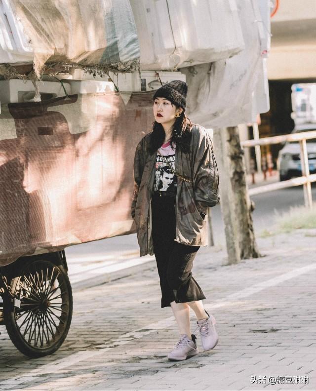 军绿色宽松外套休闲帅气,内搭黑色印花T恤,街头风随性潇洒。裙子选择修身的包臀裙,上宽下紧的穿搭对肩宽背厚的姐妹简直太友好了。