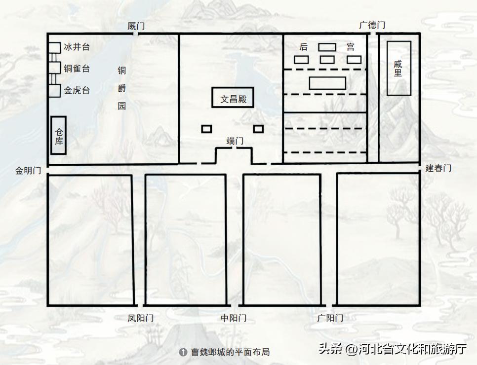定都邺城后曹操开始采取一系列措施巩固邺城的地位:扩大以邺城为中心的王畿范围、增加邺城地区的人口、发展邺城地区的水路运输、营建都城等等,这些举措一步步将邺城的发展繁荣推到了顶峰。曹魏时的邺城,以正殿“文昌殿”和中阳门的南北大道为全城中轴线,内部也划分的十分清晰:宫殿区、衙署区、贵族居住区、平民居住区……
