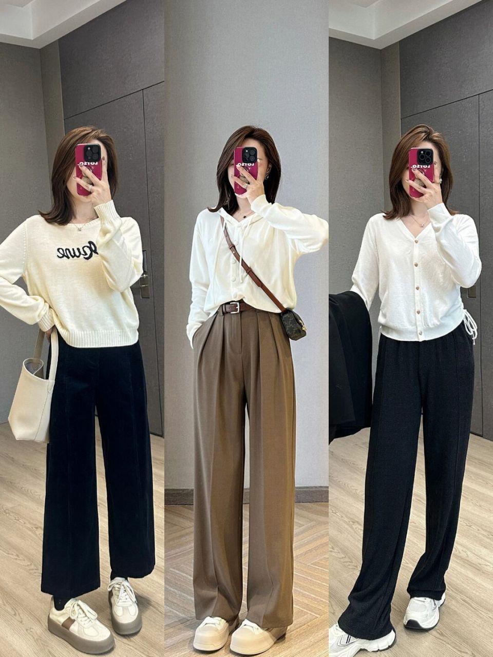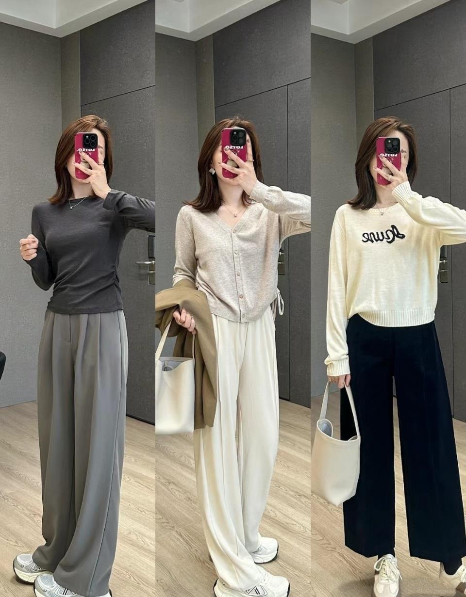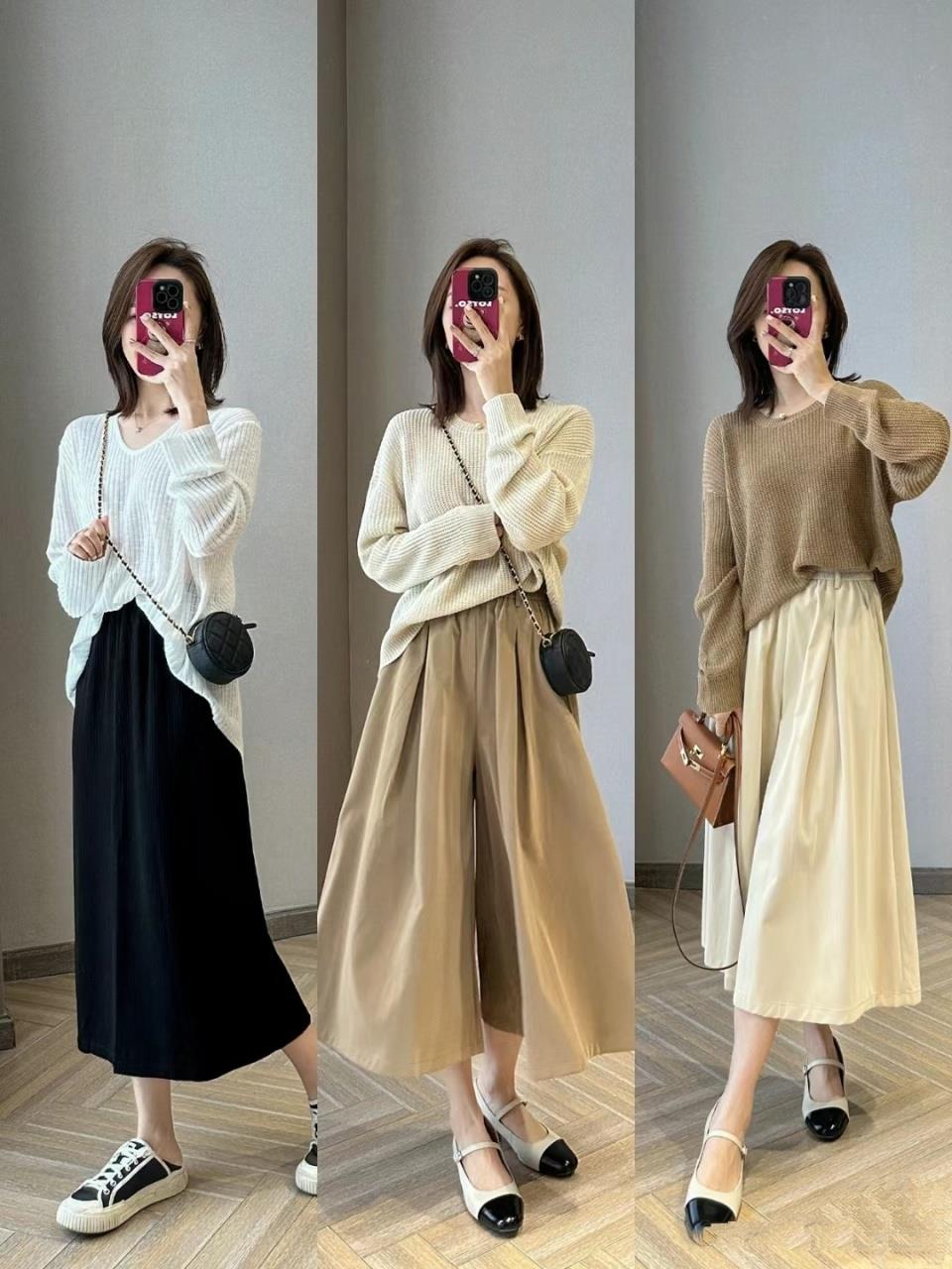 因为秋天的穿衣氛围,实在不适合直接选择浅色系套装,与其冒险尝试,不如直接像博主一样选择纯黑色下装,半裙、长裤都OK、纯黑或者其他低饱和度的彩色下装也都可以。