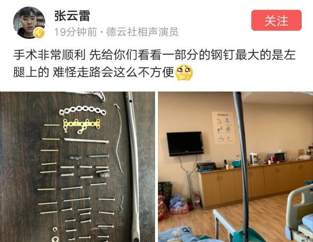 从图片来看,张云雷胸腔还有没有钢板不得而知,但是下肢的确做了手术,看到辫儿哥这几年经历的手术,让很多粉丝很心疼。