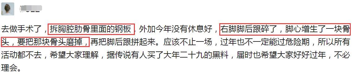 前几日有网友爆料了张云雷去医院做手术的消息,称张云雷胸腔里有钢板要拆除,另外右脚的脚跟碎了,脚心还增生了一块骨头,要把那块骨头抹掉,再把脚后跟拼起来云云。