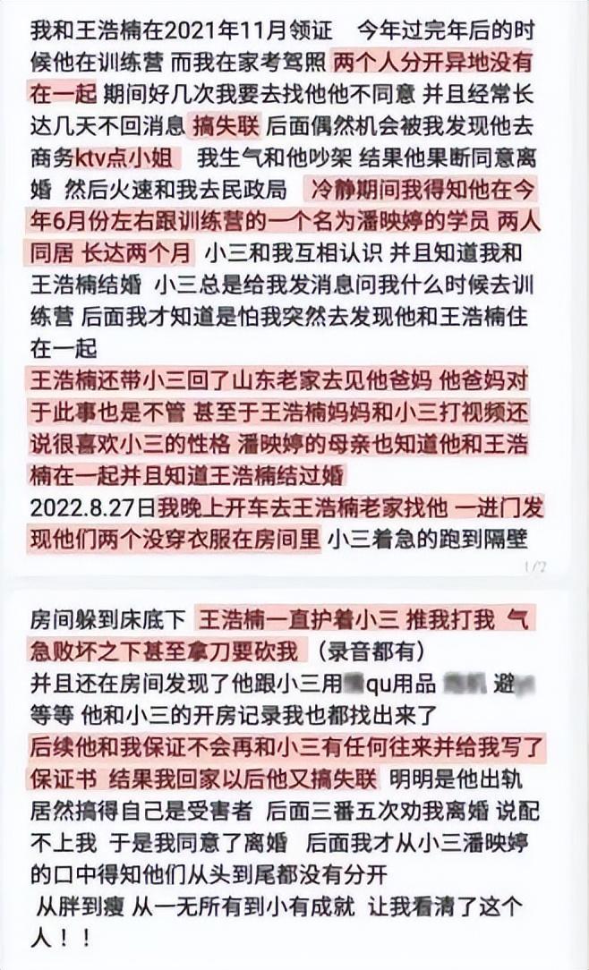 其实从2022年开始,他与妻子争吵不断,最后竟然在自己的健身训练营里出轨女学员。这位女学员本来就和原配妻子认识,并且也知道二人已婚,却还是无耻地插足二人婚姻,甚至利用与原配的交情经常询问她是否来健身房,在得到否定答复后就肆无忌惮地与王浩楠偷情。