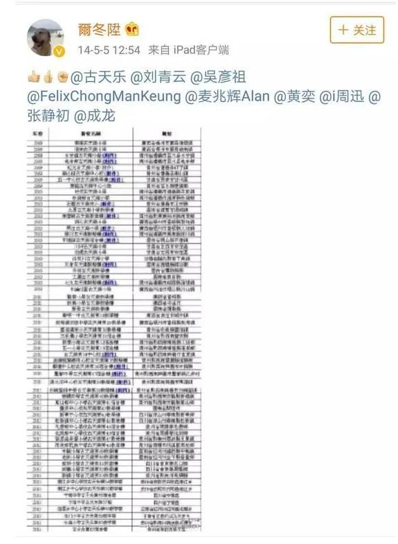 2014年,导演尔东升在微博发了一条震惊所有人的图片,其中曝光了古天乐部分捐建学校名单,大家再一次对其竖起了大拇指,纷纷为他点赞;